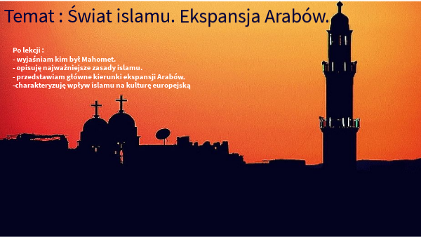 Po lekcji : - wyjaśniam kim był Mahomet. - opisuję najważniejsze zasady islamu. - przedstawiam główne kierunki ekspansji Arabów. -charakteryzuję wpływ islamu na kulturę europejską