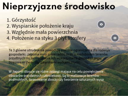 Te 3 główne utrudnienia powodują znaczne ograniczenia dla rozwoju gospodarki. Japonia musi sobie radzić m.in. z niedoborem terenów przydtnych do zamieszkania lub wykorzystania gospodarczego, trzęsiniami ziemi czy zjawiskami wulkanicznymi.