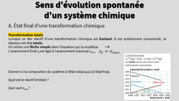 Transformation totale Lorsqu'un des réactifs d'une transformation chimique est limitant (il est entièrement consommé), la réaction est dite totale. On utilise une flèche simple dans l'équation qui la modélise. L'avancement final xf est égal à l'avancement maximal xmax. Donner ici la composition du système à l'état initial puis à l'état final. Quel est le réactif limitant ? Que vaut xmax ?