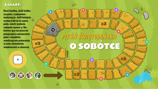 Rzuć kostką. Jeśli trafisz na pole z zadaniem - wykonaj je. Jeśłi kolejna osoba trafi na to samo pole, niech wykona zadanie numer 2. Na koniec gry raz jeszcze przejrzyjce zaznaczone pola i wspólnie zrealizujcuie polecenia w celu utrwalenia wiadomości o utworze.