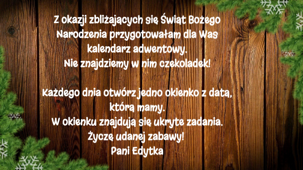 Z okazji zbliżających się Świąt Bożego Narodzenia przygotowałam dla Was kalendarz adwentowy. Nie znajdziemy w nim czekoladek! Każdego dnia otwórz jedno okienko z datą, którą mamy. W okienku znajdują się ukryte zadania. Życzę udanej zabawy! Pani Edytka