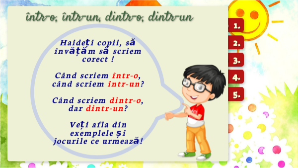 Haideți copii, să învățăm să scriem corect ! Când scriem într-o, când scriem într-un? Când scriem dintr-o, dar dintr-un? Veți afla din exemplele și jocurile ce urmează!
