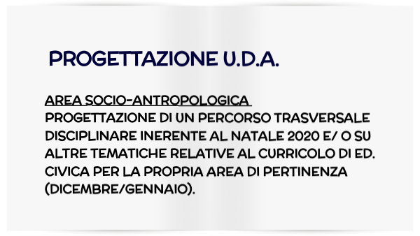 AREA SOCIO-ANTROPOLOGICA Progettazione di un percorso trasversale disciplinare inerente al Natale 2020 e/ o su altre tematiche relative al curricolo di ed. civica per la propria area di pertinenza (dicembre/gennaio).