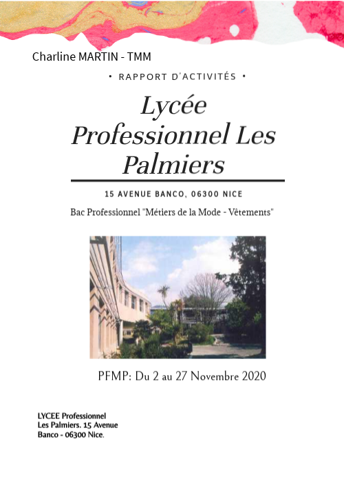 J'ai effectué mon stage au Lycée Professionnel "Les Palmiers" - 15 rue avenue banco, 06300 nice.Le but principal de mon stage a été d'effectuer des modifications sur le patron d'une robe, puis de réaliser cette dernière. mon stage s'est très bien déroulé. Les professeurs, Madame COROMINES et Madame FORTE ont été très gentilles et m'ont beaucoup aidé pour la confection de la robe. Ma période de stage m'a permi de m'améliorer un peu plus dans le domaine de la couture et d'être plus patiente.