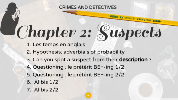 - Faire le point sur les suspects et leurs alibis (utiliser au moins deux phrases employant le prétérit et le prétérit BE+ing pour décrire ce que faisaient les suspects au moment du crime.