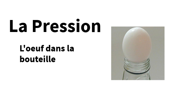 Comme la pression à l'intérieur de la bouteille devient inférieure à la pression atmosphérique, l'oeuf est <<poussé>> dans la bouteille par l'air atmosphérique. L'oeuf continue à descendre si la dépréssion est suffisamment importante pour ne pas etre compensée par la diminution du volume due au mouvement de l'oeuf.