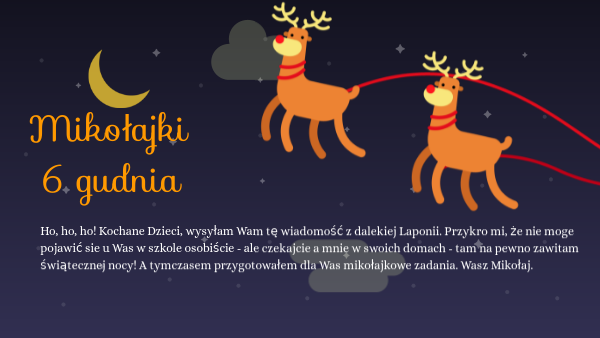 Ho, ho, ho! Kochane Dzieci, wysyłam Wam tę wiadomość z dalekiej Laponii. Przykro mi, że nie moge pojawić sie u Was w szkole osobiście - ale czekajcie a mnie w swoich domach - tam na pewno zawitam świątecznej nocy! A tymczasem przygotowałem dla Was mikołajkowe zadania. Wasz Mikołaj.
