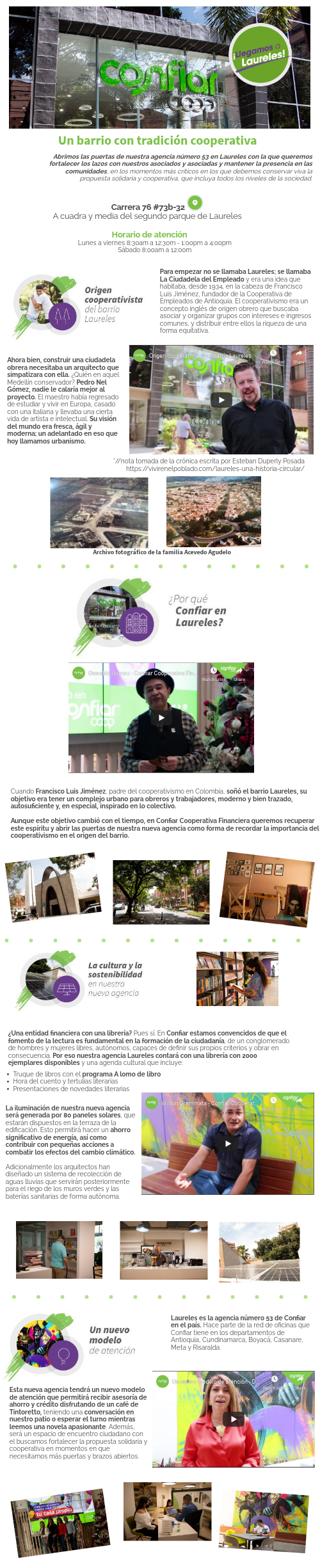 Cuando Francisco Luis Jiménez, padre del cooperativismo en Colombia, soñó el barrio Laureles, su objetivo era tener un complejo urbano para obreros y trabajadores, moderno y bien trazado, autosuficiente y, en especial, inspirado en lo colectivo. Aunque este objetivo cambió con el tiempo, en Confiar Cooperativa Financiera queremos recuperar este espíritu y abrir las puertas de nuestra nueva agencia como forma de recordar la importancia del cooperativismo en el origen del barrio.