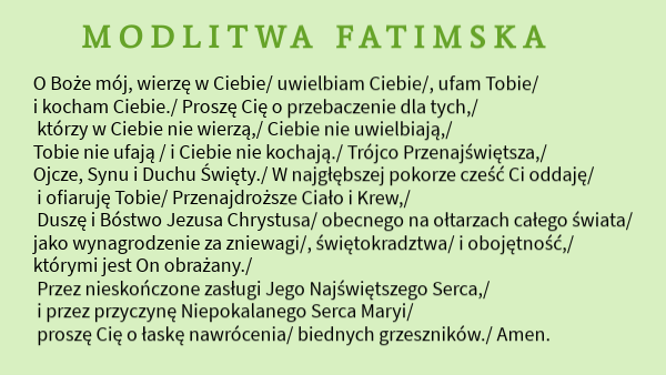 O Boże mój, wierzę w Ciebie/ uwielbiam Ciebie/, ufam Tobie/ i kocham Ciebie./ Proszę Cię o przebaczenie dla tych,/ którzy w Ciebie nie wierzą,/ Ciebie nie uwielbiają,/ Tobie nie ufają / i Ciebie nie kochają./ Trójco Przenajświętsza,/ Ojcze, Synu i Duchu Święty./ W najgłębszej pokorze cześć Ci oddaję/ i ofiaruję Tobie/ Przenajdroższe Ciało i Krew,/ Duszę i Bóstwo Jezusa Chrystusa/ obecnego na ołtarzach całego świata/ jako wynagrodzenie za zniewagi/, świętokradztwa/ i obojętność,/ którymi jest On obrażany./ Przez nieskończone zasługi Jego Najświętszego Serca,/ i przez przyczynę Niepokalanego Serca Maryi/ proszę Cię o łaskę nawrócenia/ biednych grzeszników./ Amen.