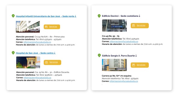 Cra 49 No. 95 - 79 Atención telefónica: Tel: (601) 4375401 Correo: informacion@fucsalud.edu.co Horario de atención: de lunes a viernes de 7:00 a.m. a 4:00 p.m.