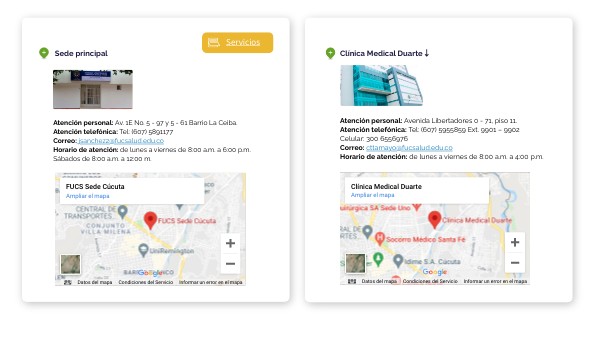 Atención personal: Av. 1E No. 5 - 97 y 5 - 61 Barrio La Ceiba. Atención telefónica: Tel: (607) 5891177 Correo: jsanchez2@fucsalud.edu.co Horario de atención: de lunes a viernes de 8:00 a.m. a 6:00 p.m. Sábados de 8:00 a.m. a 12:00 m.