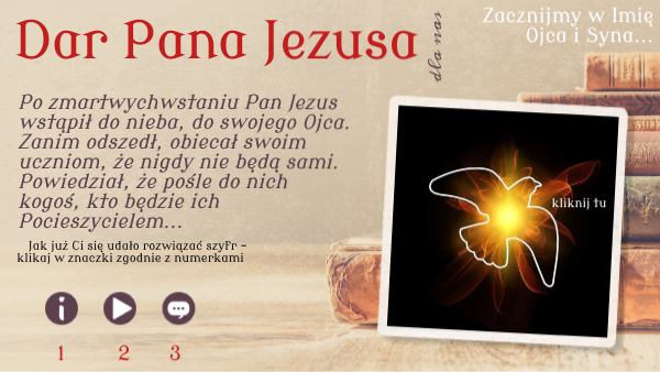 Po zmartwychwstaniu Pan Jezus wstąpił do nieba, do swojego Ojca. Zanim odszedł, obiecał swoim uczniom, że nigdy nie będą sami. Powiedział, że pośle do nich kogoś, kto będzie ich Pocieszycielem...