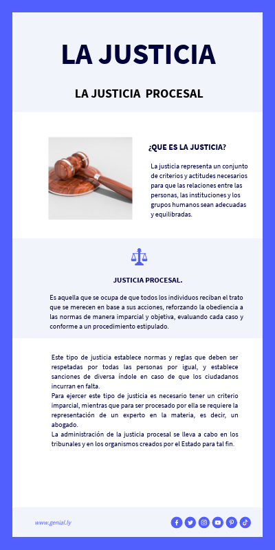 Este tipo de justicia establece normas y reglas que deben ser respetadas por todas las personas por igual, y establece sanciones de diversa índole en caso de que los ciudadanos incurran en falta. Para ejercer este tipo de justicia es necesario tener un criterio imparcial, mientras que para ser procesado por ella se requiere la representación de un experto en la materia, es decir, un abogado. La administración de la justicia procesal se lleva a cabo en los tribunales y en los organismos creados por el Estado para tal fin.