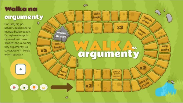 Poruszaj się po polach, zdając się na losową liczbę oczek. Do wylosowanych dylematów i haseł stwórz tezę, a do niej trzy argumenty. Za czy przeciw? - twoja w tym głowa :)