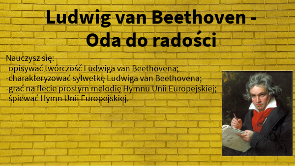 Nauczysz się: -opisywać twórczość Ludwiga van Beethovena; -charakteryzować sylwetkę Ludwiga van Beethovena; -grać na flecie prostym melodię Hymnu Unii Europejskiej; -śpiewać Hymn Unii Europejskiej.
