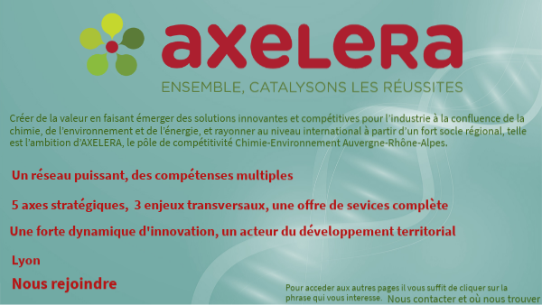 Ceci est Le pôle AXELERA est un réseau de plus de 367 adhérents associant des entreprises (PME, ETI, groupes), des laboratoires de recherche et des organismes de formation de la filière chimie-environnement.AXELERA rassemble ainsi de multiples compétences :