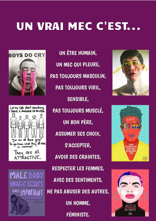 un être humain, un mec qui pleure, pas toujours masculin, pas toujours viril, sensible, pas toujours musclé, un bon père, assumer ses choix, s'accepter, avoir des craintes, respecter les femmes, avec des sentiments, ne pas abuser des autres, un homme, féministe.