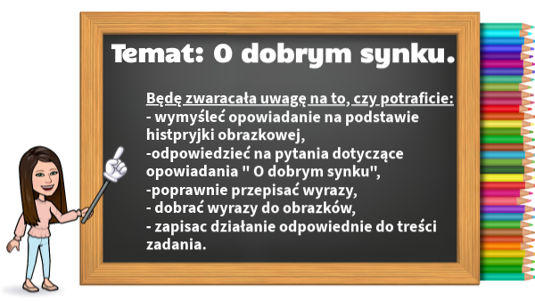 Będę zwaracała uwagę na to, czy potraficie: - wymyśleć opowiadanie na podstawie histpryjki obrazkowej, -odpowiedzieć na pytania dotyczące opowiadania " O dobrym synku", -poprawnie przepisać wyrazy, - dobrać wyrazy do obrazków, - zapisac działanie odpowiednie do treści zadania.