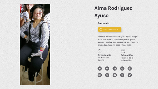 Hola me llamo Alma Rodríguez Ayuso tengo 21 años vivo Madrid Getafe lo que me gusta ayudar y cocinar con padres ir a ocio hago mi propia banda en mi casa y hago todo.