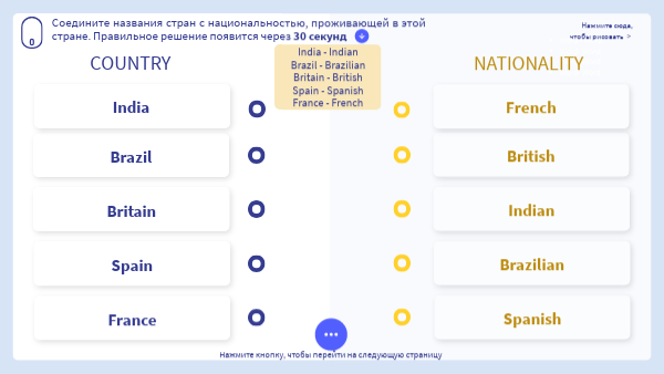 Соедините названия стран с национальностью, проживающей в этой стране. Правильное решение появится через 30 секунд