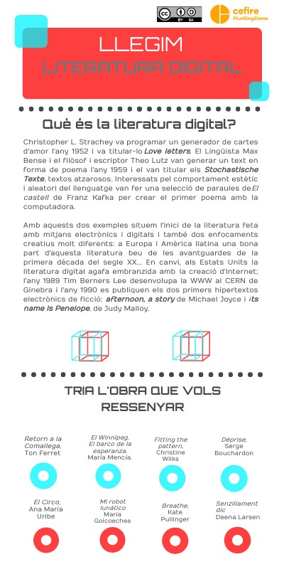 Christopher L. Strachey va programar un generador de cartes d'amor l'any 1952 i va titular-lo Love letters. El Lingüista Max Bense i el filòsof i escriptor Theo Lutz van generar un text en forma de poema l'any 1959 i el van titular els Stochastische Texte, textos atzarosos. Interessats pel comportament estètic i aleatori del llenguatge van fer una selecció de paraules de El castell de Franz Kafka per crear el primer poema amb la computadora. Amb aquests dos exemples situem l'inici de la literatura feta amb mitjans electrònics i digitals i també dos enfocaments creatius molt diferents: a Europa i Amèrica llatina una bona part d'aquesta literatura beu de les avantguardes de la primera dècada del segle XX... En canvi, als Estats Units la literatura digital agafa embranzida amb la creació d'Internet; l'any 1989 Tim Berners Lee desenvolupa la WWW al CERN de Ginebra i l'any 1990 es publiquen els dos primers hipertextos electrònics de ficció: afternoon, a story de Michael Joyce i its name is Penelope, de Judy Malloy.