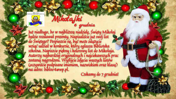 Już niedługo, bo w najbliższą niedzielę, Święty Mikołaj będzie rozdawał prezenty. Napisaliście już swój list do Świętego? Pospieszcie się, być może zdążycie wziąć udział w konkursie, który ogłasza Biblioteka szkolna. Napiszcie piękny i kolorowy list do Mikołaja. Autorzy najbardziej oryginalnych i najciekawszych prac zostaną nagrodzeni. Wyślijcie zdjęcia waszych listów (oczywiście podpisane imieniem, nazwiskiem oraz klasą) na adres: biblnr4@wp.pl. Czekamy do 7 grudnia!