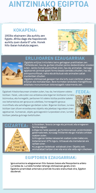 ·Egiptoko erlijioa 3 milurteko baino gehiagoan praktikatzen zen. ·Politeista zen, hau da, gurtzen zituzten jainko desberdinetan sinesten zuten. Jainko horiek zoomorfoak ziren, hau da; animaliak.. Geroago egiptoarrek jainkoak gizaki forma bezala izendatu zituzten, hau da; antropomorfikoak, nahiz eta atributuak edo animalien zatiak mantentzen zituzten. ·Egiptoko zibilizazioak garapen han dia lortu zuen zientzian, artean, erlijioan eta merkataritzan. Bere hormetan landutako hieroglifikoez estalitako monumentuen dotoreziagatik nabarmendu zen.