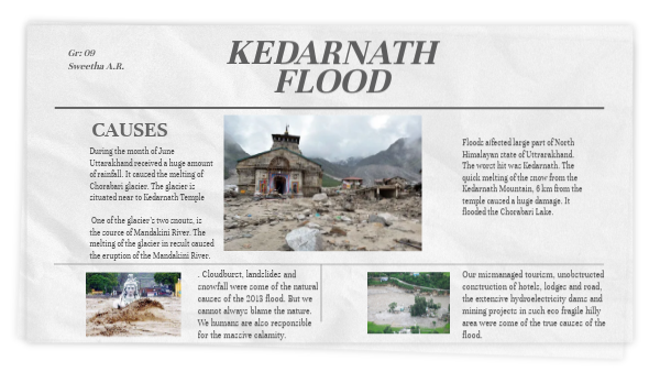Floods affected large part of North Himalayan state of Uttrarakhand. The worst hit was Kedarnath. The quick melting of the snow from the Kedarnath Mountain, 6 km from the temple caused a huge damage. It flooded the Chorabari Lake.