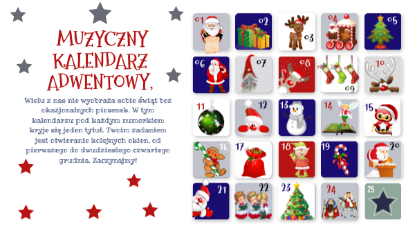 Wielu z nas nie wyobraża sobie świąt bez okazjonalnych piosenek. W tym kalendarzu pod każdym numerkiem kryje się jeden tytuł. Twoim zadaniem jest otwieranie kolejnych okien, od pierwszego do dwudziestego czwartego grudnia. Zaczynajmy!
