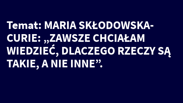 Temat: MARIA SKŁODOWSKA-CURIE: „ZAWSZE CHCIAŁAM WIEDZIEĆ, DLACZEGO RZECZY SĄ TAKIE, A NIE INNE”.