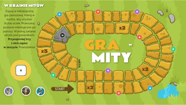 Zagraj w mitologiczną grę planszową. Kliknij w kostkę, aby uzyskać liczbę oczek. Przesuwaj postacie mitologiczne po planszy. Wykonaj zadania ukryte pod gwiazdkami. Przynajmniej trzy z nich zapisz w zeszycie. Powodzenia!