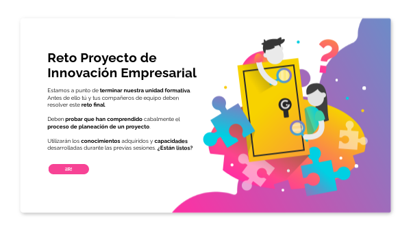 Estamos a punto de terminar nuestra unidad formativa. Antes de ello tú y tus compañeros de equipo deben resolver este reto final. Deben probar que han comprendido cabalmente el proceso de planeación de un proyecto. Utilizarán los conocimientos adquiridos y capacidades desarrolladas durante las previas sesiones. ¿Están listos?
