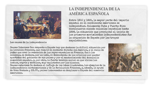 Entre 1810 y 1825, la mayor parte del imperio español en el continente americano se independizó. Solamente Cuba y Puerto Rico continuaron siendo colonias españolas hasta 1898. La situación que precipitó el inicio de los primeros movimientos independentistas fue la ocupación de España por las tropas napoleónicas.