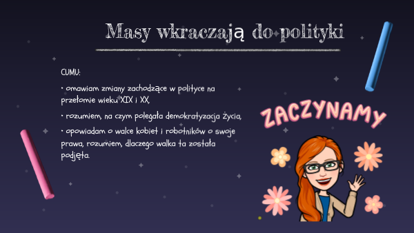 CUMU: • omawiam zmiany zachodzące w polityce na przełomie wieku XIX i XX, • rozumiem, na czym polegała demokratyzacja życia, • opowiadam o walce kobiet i robotników o swoje prawa, rozumiem, dlaczego walka ta została podjęta.