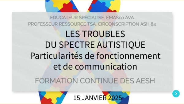 Calendrier 15/01/2025 Module 1 Particularités de fonctionnement et communication 29/01/2025 Module 2 La prévention des comportements-problèmes 05/02/2025 Module 3 Les gestes professionels