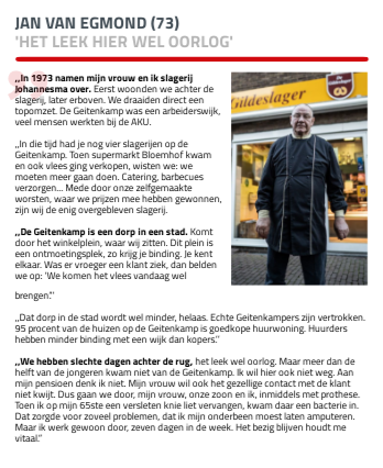 brengen’.’’ ,,Dat dorp in de stad wordt wel minder, helaas. Echte Geitenkampers zijn vertrokken. 95 procent van de huizen op de Geitenkamp is goedkope huurwoning. Huurders hebben minder binding met een wijk dan kopers.’’ ,,We hebben slechte dagen achter de rug, het leek wel oorlog. Maar meer dan de helft van de jongeren kwam niet van de Geitenkamp. Ik wil hier ook niet weg. Aan mijn pensioen denk ik niet. Mijn vrouw wil ook het gezellige contact met de klant niet kwijt. Dus gaan we door, mijn vrouw, onze zoon en ik, inmiddels met prothese. Toen ik op mijn 65ste een versleten knie liet vervangen, kwam daar een bacterie in. Dat zorgde voor zoveel problemen, dat ik mijn onderbeen moest laten amputeren. Maar ik werk gewoon door, zeven dagen in de week. Het bezig blijven houdt me vitaal.”