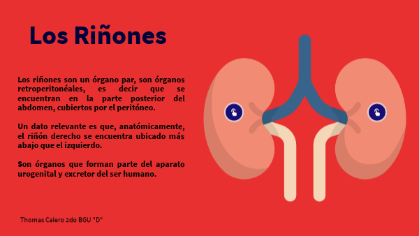 Los riñones son un órgano par, son órganos retroperitonéales, es decir que se encuentran en la parte posterior del abdomen, cubiertos por el peritóneo. Un dato relevante es que, anatómicamente, el riñón derecho se encuentra ubicado más abajo que el izquierdo. Son órganos que forman parte del aparato urogenital y excretor del ser humano.