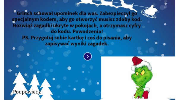 Grinch schował upominek dla was. Zabezpieczył go specjalnym kodem, aby go otworzyć musisz zdoby kod. Rozwiąż zagadki ukryte w pokojach, a otrzymasz cyfry do kodu. Powodzenia! PS. Przygotuj sobie kartkę i coś do pisania, aby zapisywać wyniki zagadek.