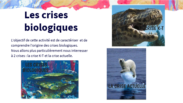 L'objectif de cette activité est de caractériser et de comprendre l'origine des crises biologiques. Nous allons plus particulièrement nous interresser à 2 crises : la crise K-T et la crise actuelle.