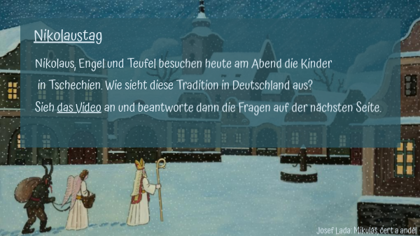 Nikolaus, Engel und Teufel besuchen heute am Abend die Kinder in Tschechien. Wie sieht diese Tradition in Deutschland aus? Sieh das Video an und beantworte dann die Fragen auf der nächsten Seite.