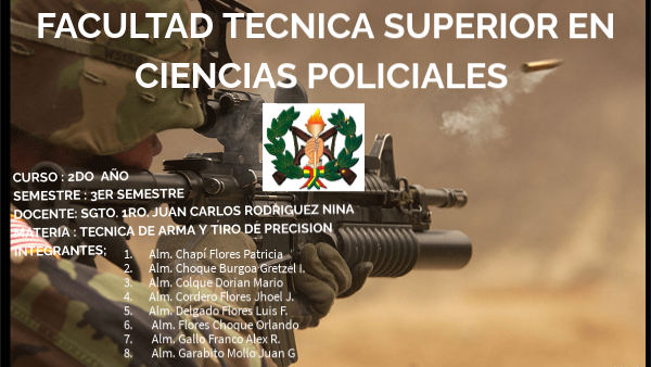 CURSO : 2DO AÑO SEMESTRE : 3ER SEMESTRE DOCENTE: SGTO. 1RO. JUAN CARLOS RODRIGUEZ NINA MATERIA : TECNICA DE ARMA Y TIRO DE PRECISION INTEGRANTES;