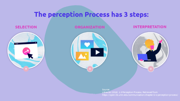 Source: Libraries (2016). 1.3 Perception Process. Retrieved from https://open.lib.umn.edu/communication/chapter/2-1-perception-process/