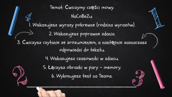 Temat: Ćwiczymy części mowy. NaCoBeZu: 1. Wskazujesz wyrazy pokrewne (rodzina wyrazów). 2. Wskazujesz poprawne zdania. 3. Ćwiczysz czytanie ze zrozumieniem, a następnie zaznaczasz odpowiedzi do tekstu. 4. Wskazujesz czasowniki w zdaniu. 5. Łączysz obrazki w pary - memory. 6. Wykonujesz test na Teams.