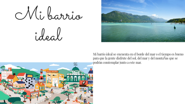 Mi barrio ideal será muy ecológico gracias a las turbinas eólicas que permiten producir electricidad de forma natural. No habrá puerto para evitar la contaminación de los océanos y la naturaleza. Los residuos que dañarán la salud de este barrio no serán bienvenidos. Pero en este barrio habrá todas las cosas necesarias a la necesidad de la población y que les permitirán el bienestar y la comodidad dentro de este barrio. Habrá, pues, un parque de skate para que los jóvenes se encuentren allí, un hospital para curar a las personas enfermas, un gimnasio de deporte para todas las personas que deseen practicar deporte, una pista de patinaje durante los periodos fríos del año, un supermercado y una panadería para alimentarse. Mi barrio ideal tendrá también un gran estudio de baile que será conocido en toda Francia. Este estudio hará donaciones con el dinero que gane.