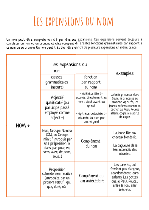 Un nom peut être complété (enrichi) par diverses expansions. Ces expansions servent toujours à compléter un nom ou un pronom, et elles occupent différentes fonctions grammaticales par rapport à ce nom ou ce pronom. Un nom peut très bien être enrichi de plusieurs expansions en même temps !