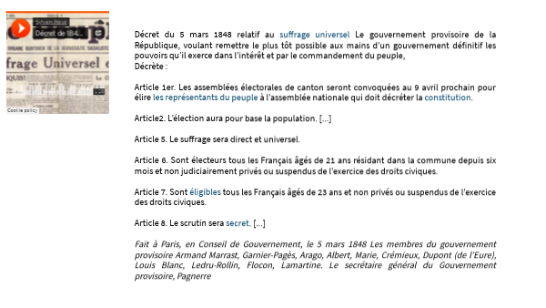 Décret du 5 mars 1848 relatif au suffrage universel Le gouvernement provisoire de la République, voulant remettre le plus tôt possible aux mains d’un gouvernement définitif les pouvoirs qu’il exerce dans l’intérêt et par le commandement du peuple, Décrète : Article 1er. Les assemblées électorales de canton seront convoquées au 9 avril prochain pour élire les représentants du peuple à l’assemblée nationale qui doit décréter la constitution. Article2. L’élection aura pour base la population. [...] Article 5. Le suffrage sera direct et universel. Article 6. Sont électeurs tous les Français âgés de 21 ans résidant dans la commune depuis six mois et non judiciairement privés ou suspendus de l’exercice des droits civiques. Article 7. Sont éligibles tous les Français âgés de 23 ans et non privés ou suspendus de l’exercice des droits civiques. Article 8. Le scrutin sera secret. [...] Fait à Paris, en Conseil de Gouvernement, le 5 mars 1848 Les membres du gouvernement provisoire Armand Marrast, Garnier-Pagès, Arago, Albert, Marie, Crémieux, Dupont (de l’Eure), Louis Blanc, Ledru-Rollin, Flocon, Lamartine. Le secrétaire général du Gouvernement provisoire, Pagnerre
