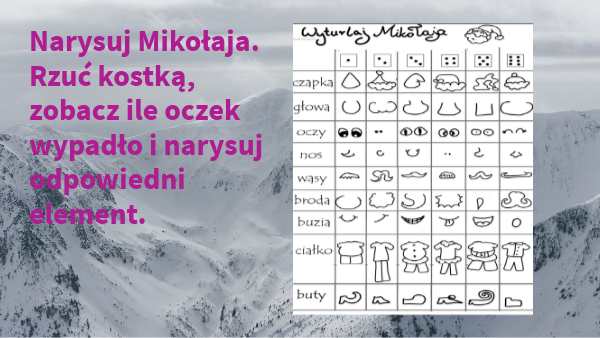 Narysuj Mikołaja. Rzuć kostką, zobacz ile oczek wypadło i narysuj odpowiedni element.