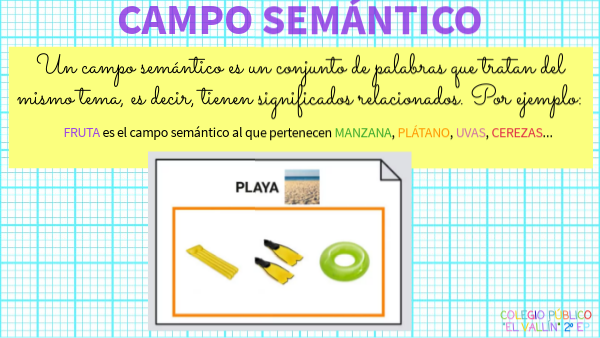 FRUTA es el campo semántico al que pertenecen MANZANA, PLÁTANO, UVAS, CEREZAS...