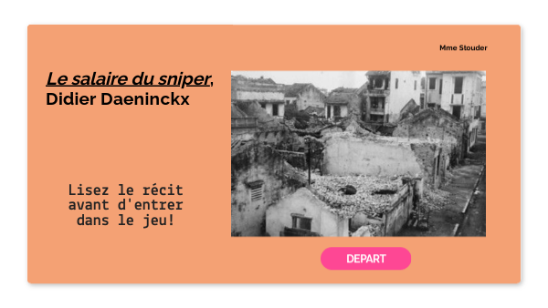 Bravo! Vous avez retrouvé Katarina! Elle a bien besoin d'argent pour nourrir et soigner les enfants... Cliquez sur les 250$ pour les lui donner. Votre mission sera presque terminée ; il ne vous restera plus qu'à rentrer à votre hôtel avant de repartir dès que possible...