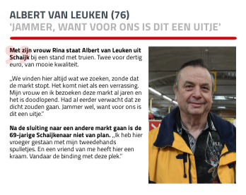 Met zijn vrouw Rina staat Albert van Leuken uit Schaijk bij een stand met truien. Twee voor dertig euro, van mooie kwaliteit. ,,We vinden hier altijd wat we zoeken, zonde dat de markt stopt. Het komt niet als een verrassing. Mijn vrouw en ik bezoeken deze markt al jaren en het is doodlopend. Had al eerder verwacht dat ze dicht zouden gaan. Jammer wel, want voor ons is dit een uitje.” Na de sluiting naar een andere markt gaan is de 69-jarige Schaijkenaar niet van plan. ,,Ik heb hier vroeger gestaan met mijn tweedehands spulletjes. En een vriend van me heeft hier een kraam. Vandaar de binding met deze plek.”
